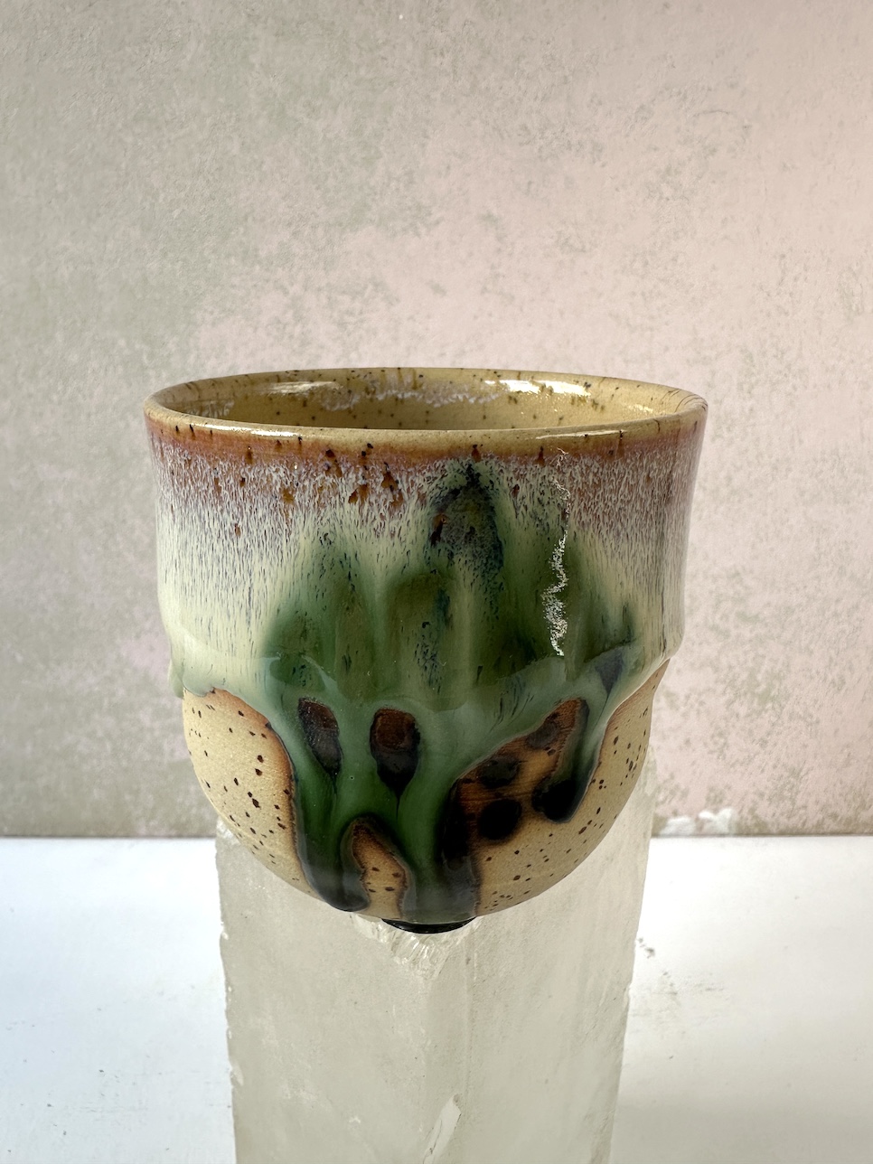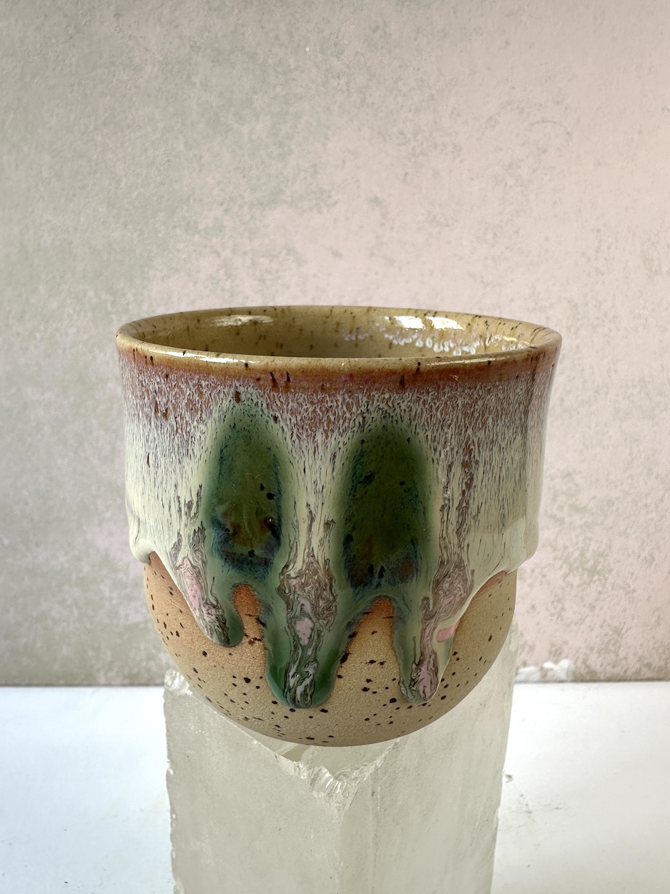 Kolekcja Przepływ - przy tych pracach eksploruję szkliwa, które mają tendencję do "płynięcia" w trakcie wypału. Łączę je z innymi, mieszam i sprawdzam granice materii. Powstają często szalone kompozycje kolorystyczne, zastygłe krople i przepływy. Trochę jak lodowiec, trochę jak lawa.