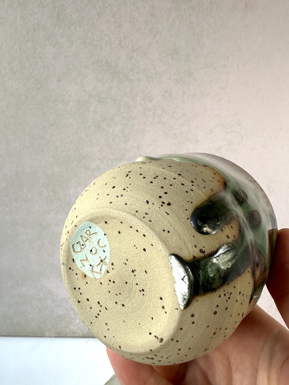 Zawsze zostawiam naturalną glinę na dole naczynia, tworzy to przyjemny kontrast z błyskiem na górze. W środku błyszczące transparentne szkliwo.