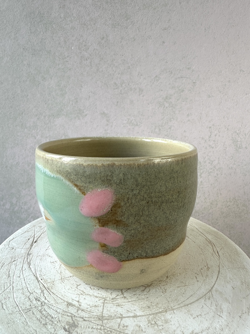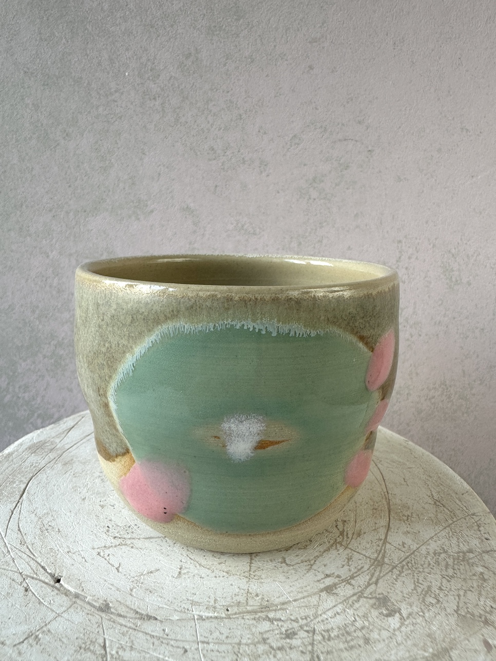 Kolekcja Przepływ - przy tych pracach eksploruję szkliwa, które mają tendencję do "płynięcia" w trakcie wypału. Łączę je z innymi, mieszam i sprawdzam granice materii. Powstają często szalone kompozycje kolorystyczne, zastygłe krople i przepływy. Trochę jak lodowiec, trochę jak lawa.