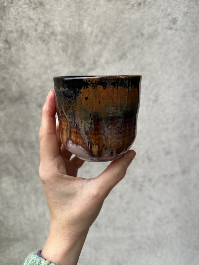 Brąz, pomarańcz, róż i ściekające szkliwo. Malarskie pociągnięcia pędzla i kropki. Abstrakcyjny obraz na glinie. Mat i błyski.