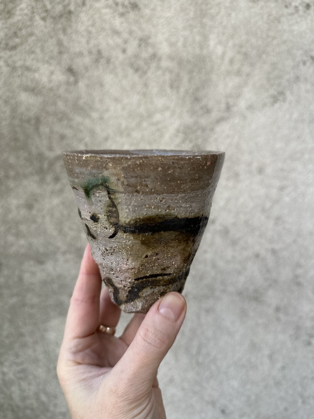 Glina z dużym szamotem, struktura surowa, ale w środku i na brzegach pokryta gładkim szkliwem, więc miło z niej pić.