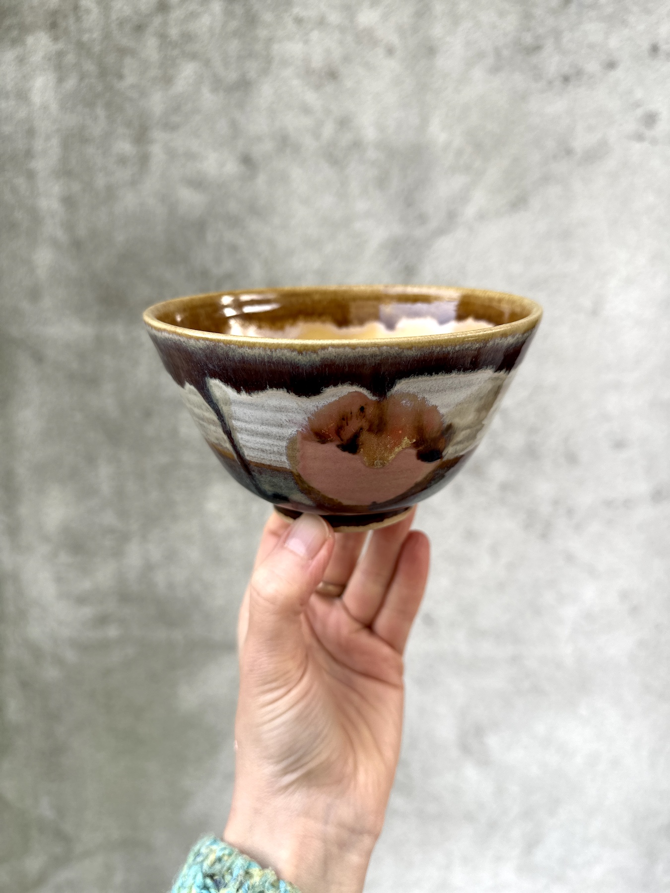 W środku promienny, żółty, satynowy kolor, na zewnątrz brąz i pomarańcz i przepływy szkliwa.