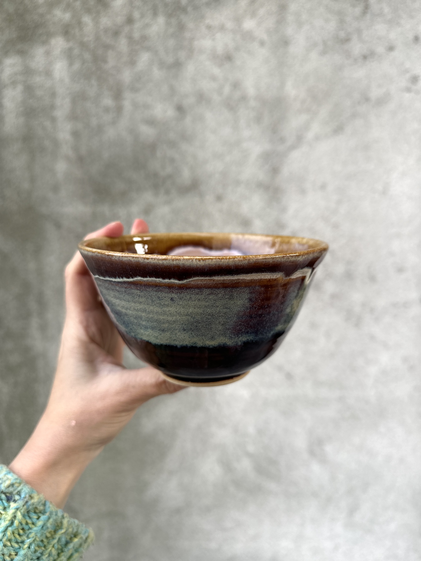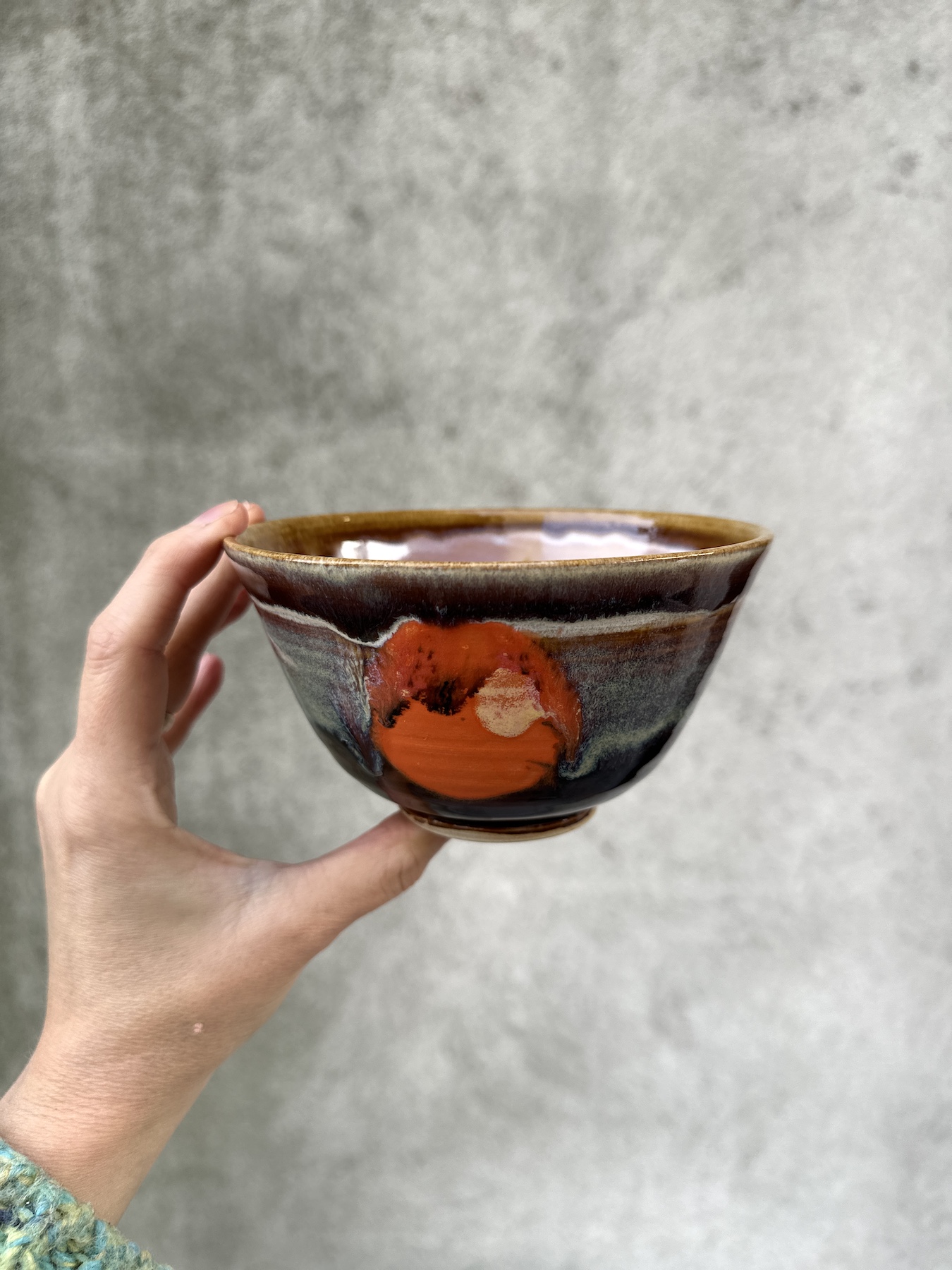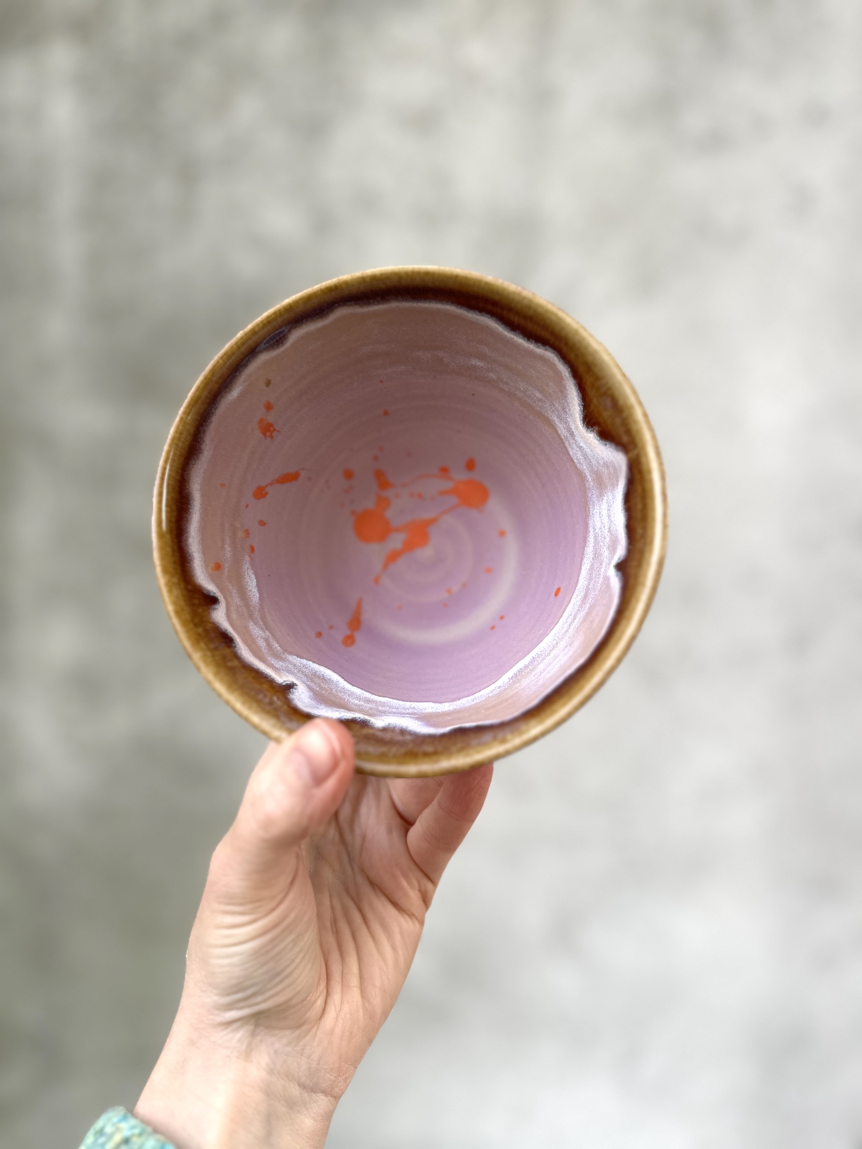 W środku piękny, satynowy lila róż i pomarańczowe plamki, na zewnątrz brąz i pomarańcz i przepływy szkliwa.