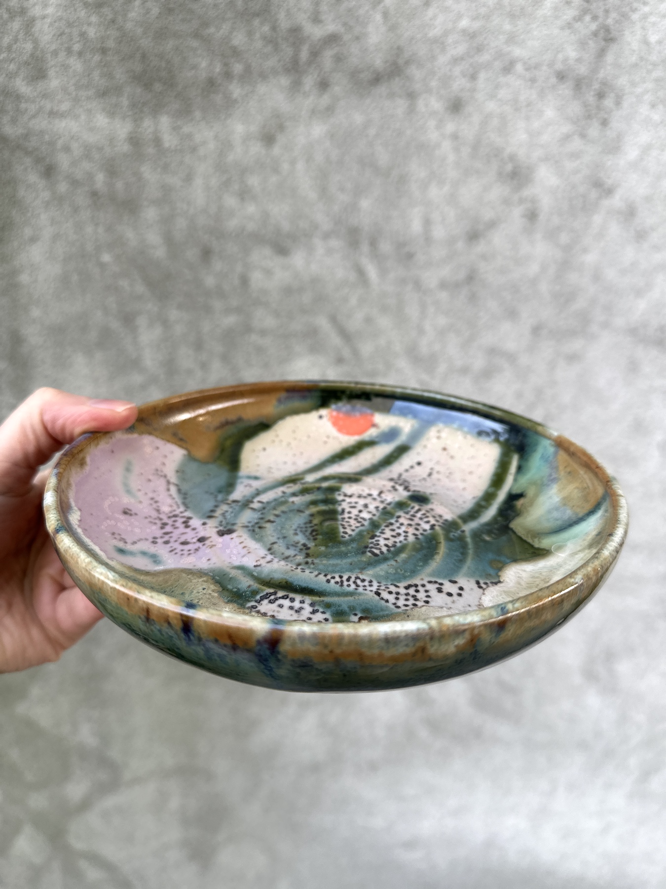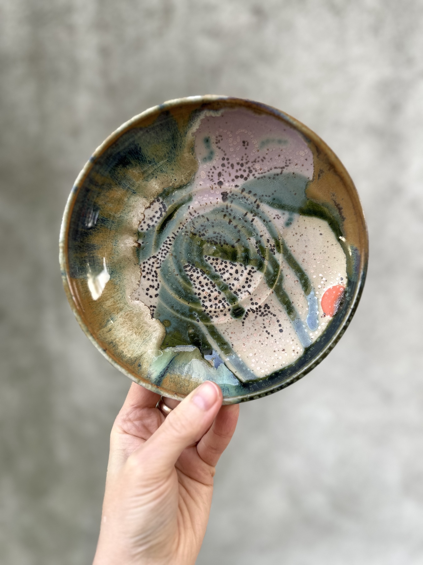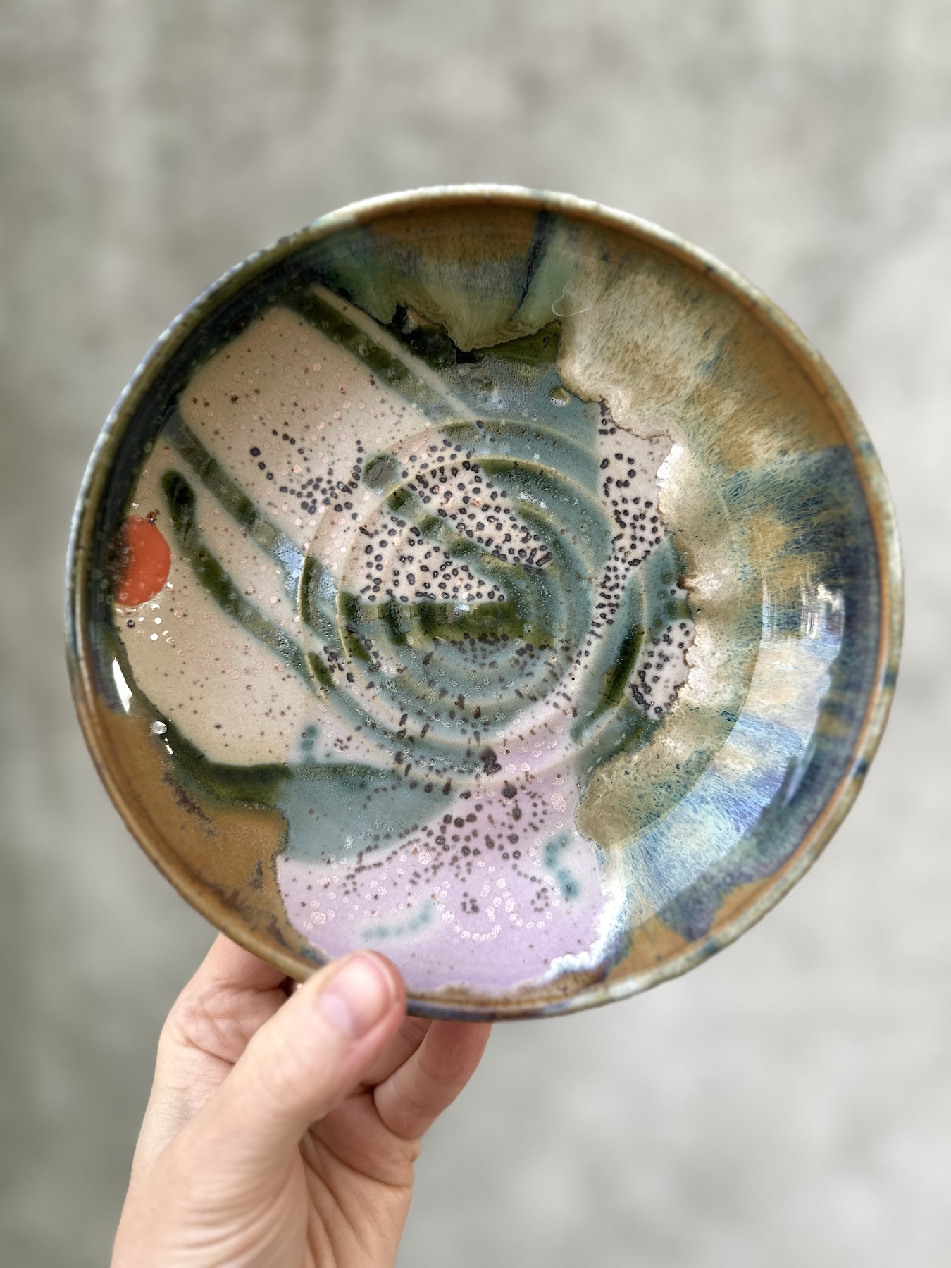 Pokryty abstrakcyjnymi plamami szkliw, oraz setkami malutkich kropek, które w skupieniu maluję na niektórych pracach.